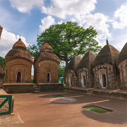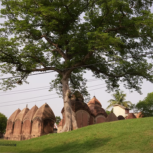 Located 18-22 km east of Bolpur Shantiniketan, Basuli Bishalakshi Temple is situated in the village of Nanoor, the birthplace of the revered 14th-century Bengali poet Dwija Chandidas. The current temple structure comprises 14-15 temples that represent Bengal’s unique Charchala and Aatchala temple tradition, along with terracotta carvings. While the original Basuli Devi temple was destroyed by invaders, it was reconstructed in the early 18th century by the local zamindar, Ramjeevan Roy. There is a huge archaeological mound adjacent to the temple complex, locally known as Chandidas Bhita or Chandidas Dhibi.