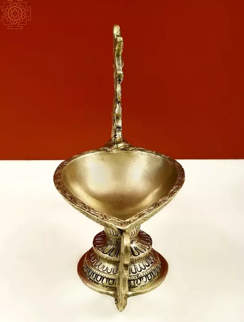 This single-wick portable lamp is a simple yet beautiful brass Diya that represents the path from darkness to light. The lamp is the most classic style, with its simple body and one wick, and it is the finest approach to begin regular devotional practice. It has an unusual handle in the shape of a beautiful branch and a raised platform for an Aarti Diya. It has a shallow oil basin and may also be used for Camphor Aarti. The lamps body is etched with exquisite designs that contribute to the pieces attractiveness. Including this Diya in your daily rituals of giving fire to the gods will bring you, their favors.