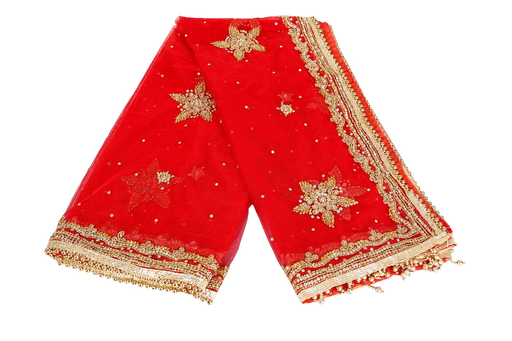 Essential Durga Puja items featuring chunri include red, gold-bordered net or silk Mata Chunri used for decorating idols (specifically Maa Durga, Lakshmi, and Saraswati) and as offerings. Common products include 9-color sets for 9 days, embroidered bandhani designs, and large 2-meter fabrics for, among others, Mata ki Chowki.